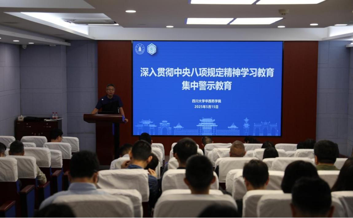 为扎实开展深入贯彻中央八项规定精神学习教育,进一步强化作风建设,营造风清气正的育人环境,2025年5月15日,华西药学院于康弘报告厅召开全院教职工大会,开展深入贯彻中央八项规定精神学习教育集中警示教育。学院在家院领导及全体教职工参加,院党委副书记兼纪委书记章程主持。